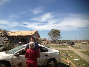 ![]() Post storm: Third year student Chris Goelz, standing in front of the destroyed car he used to commute to University of Oklahoma College of Dentistry, talks with a neighbor on Ginger Rd. Plaza Towers Elementary School, which his oldest son attended, is in the background. Photos courtesy of Chad Carter, OU dental student |